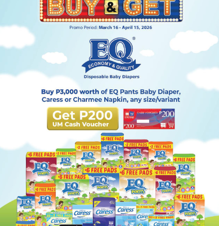 Buy P 3,000 worth of Caress or Charmee Napkin or EQ Pants Baby Diaper product of any size and variant, and get P 200 UM Cash Voucher. Promo runs from March 16 to April15, 2026.