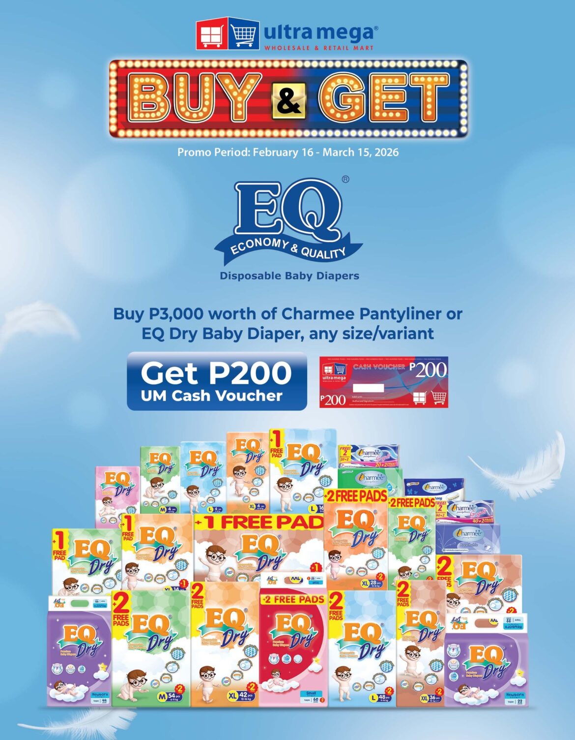 Buy P 3,000 worth of Charmee Pantiliner or EQ Dry Baby Diaper product of any size and variant, and get P 200 UM Cash Voucher. Promo runs from Feb 16 to March 15, 2026.