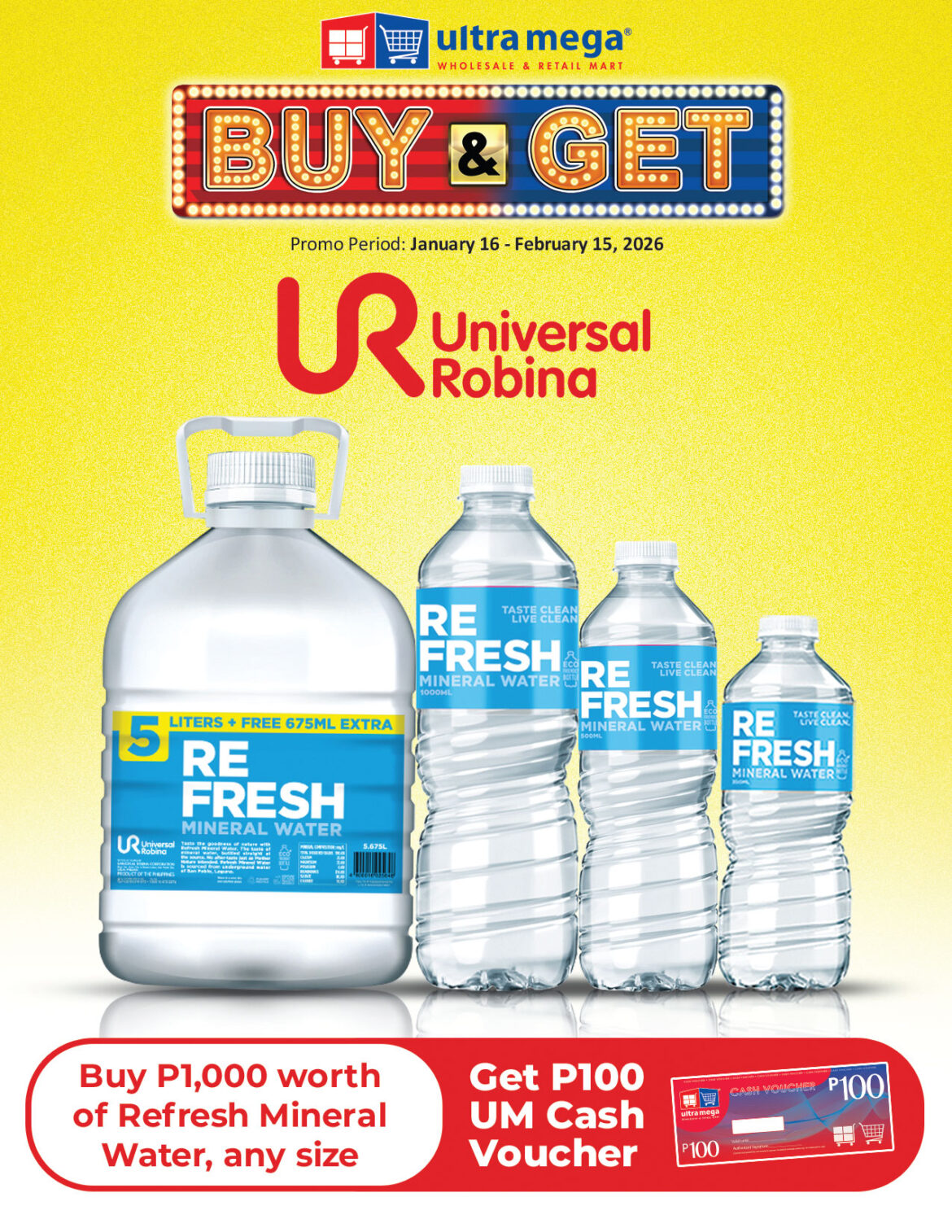 Buy P1,000 worth of Refresh Mineral Water of any size and receive a P100 UM cash voucher. Promo runs from January 16 – February 16, 2026.