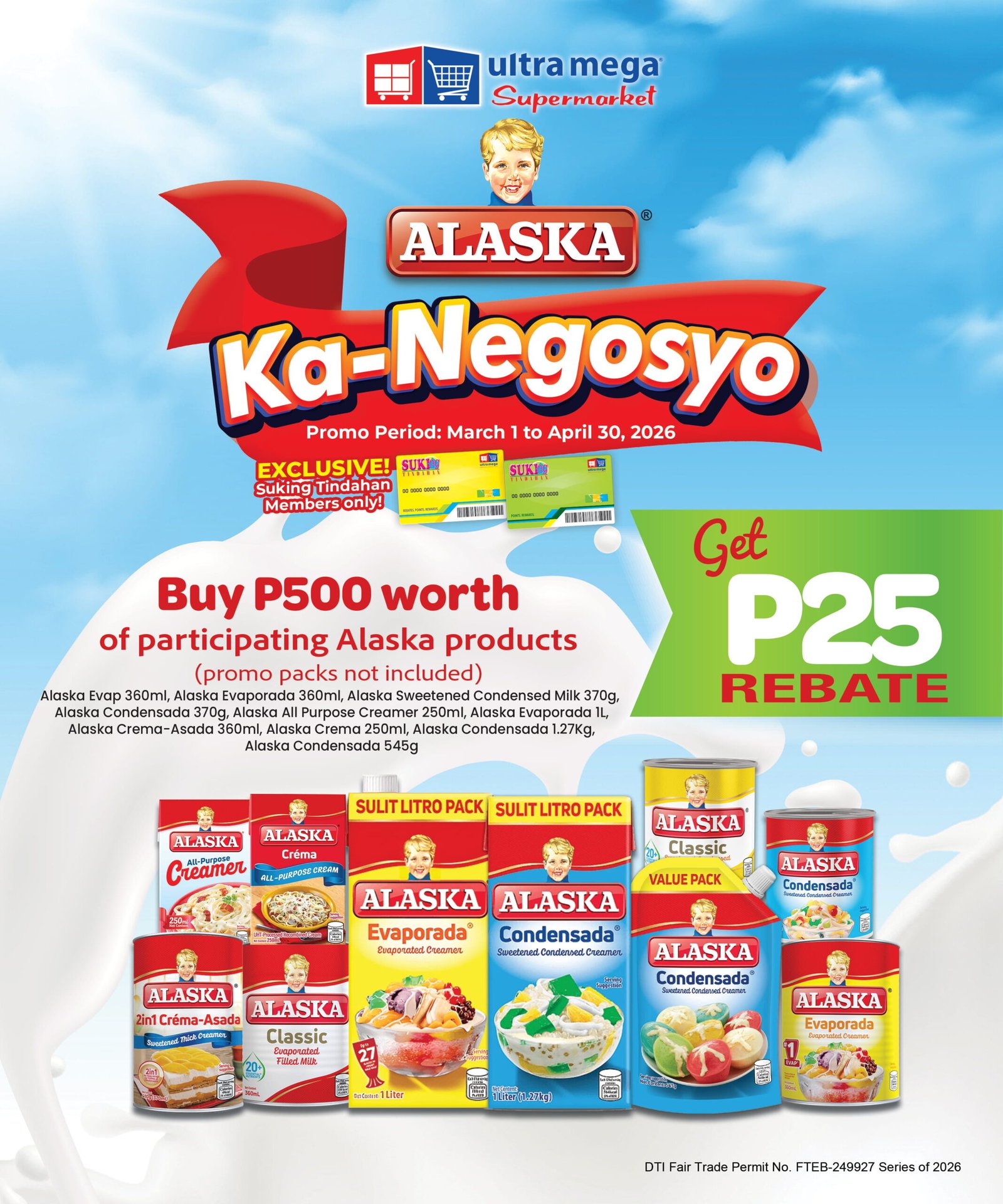 - Every P500 worth of participating Alaska Products (except promo packs) at any Ultra Mega branch, Suking Tindahan Members get an instant P25 rebate. (Participating products: Alaska Evap 360ml, Alaska Evaporada 360ml, Alaska Sweetened Condensed Milk 370g, Alaska Condensada 370g, Alaska All Purpose Creamer 250ml, Alaska Evaporada 1L, Alaska Crema-asada 360ml, Alaska Crema 250ml, Alaska Condensada 1.27kg, Alaska Condensada 545g).