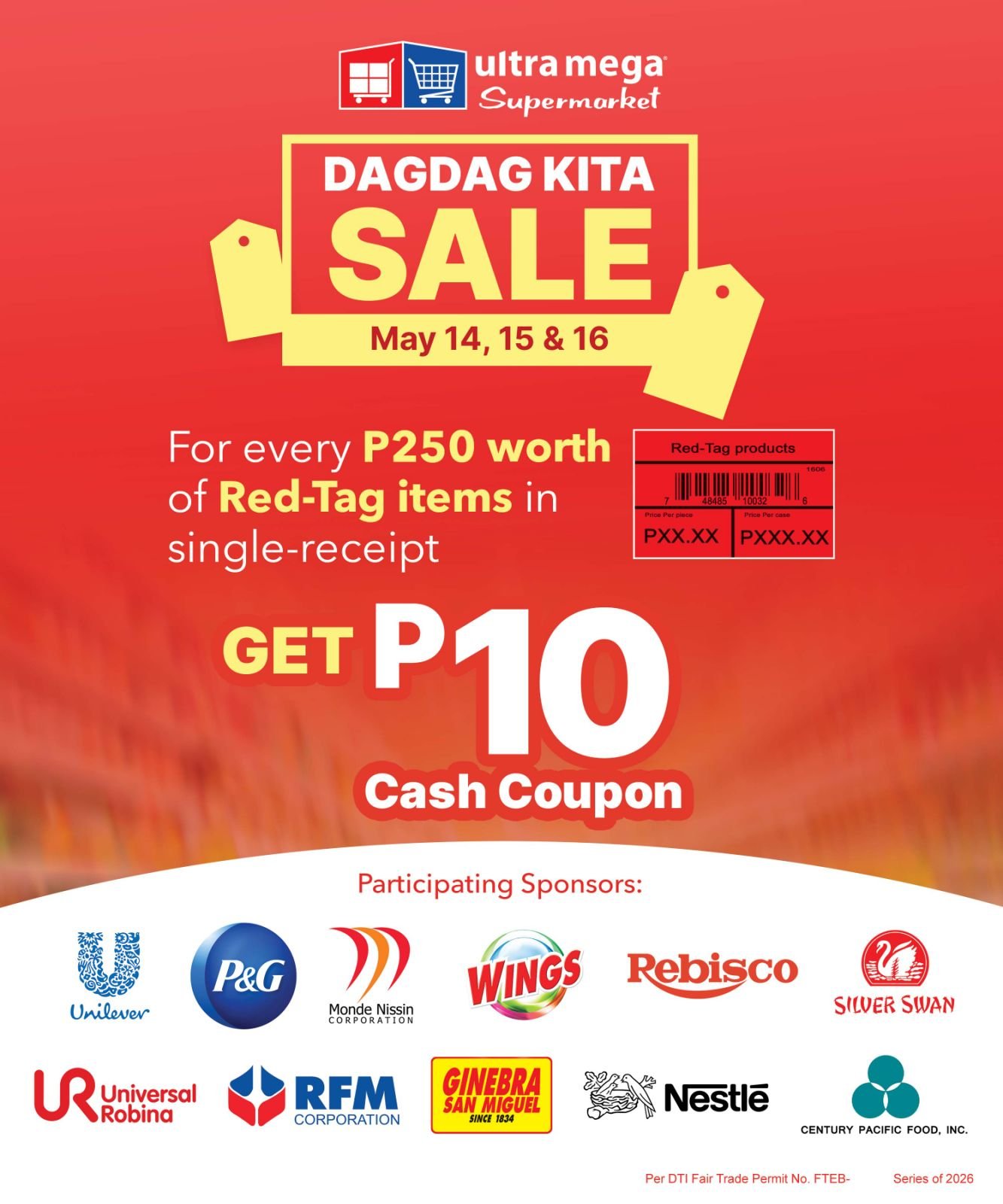 Title: Dagdag Kita Sale Promo Period: May 14, 15 & 16, 2026 BRANCH: All Supermarket & Grocery Mechanics: 1. Every P250 single-receipt purchase of RED-TAG product/s, customers get P10.00 CASH COUPON 2. After payment, the customer must proceed to the …